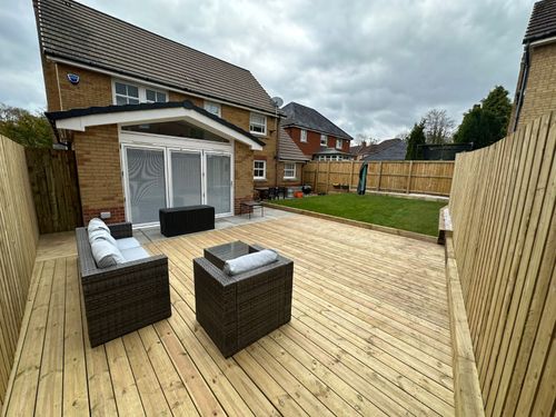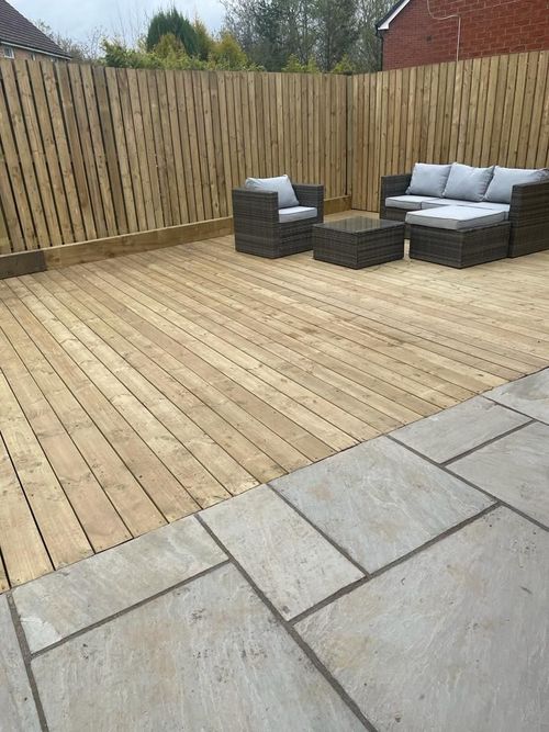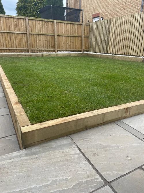 - Laying down turf, and floor decking, along with a bordering of decorative chips